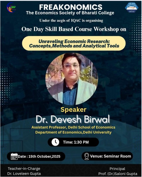 Freakonomics, The Economics Society of Bharati College, under the aegis of IQAC, is organizing a Skill-Based Course Workshop on "Unraveling Economic Research: Concepts, Methods and Analytical Tools"