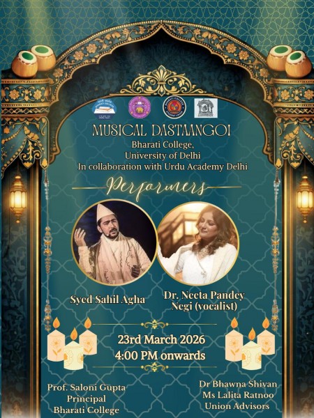 Experience an enchanting evening as Bharati College presents Musical Dastaangoi. Witness the seamless harmony of timeless storytelling and evocative live performance, brought to life by the legendary Syed Sahil Agha and the soulful vocalist Dr. Neeta Pandey Negi.