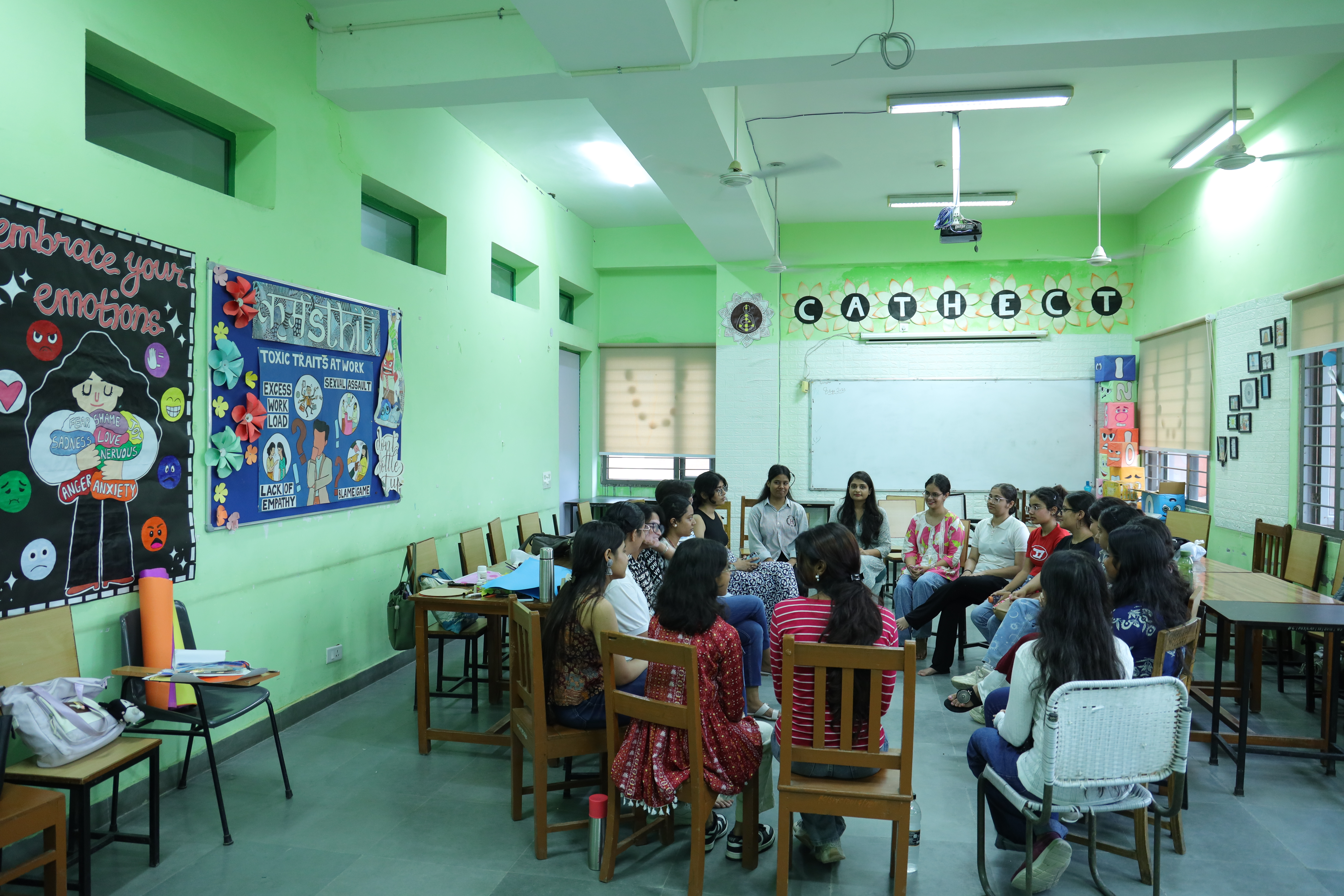 The Psychology Lab is located on the third floor, new academic block. It is equipped with standardized psychological tools and experimental materials essential for practical training. It allows students to conduct psychological assessments, experiments, and research in a supervised academic setting to deepen their understanding of human behavior. To ensure the mental well-being of our students, the faculty members organise ‘Feelings ka Adda’ sessions to provide a flexible environment for students to discuss anxieties and issues faced in their everyday life on campus.