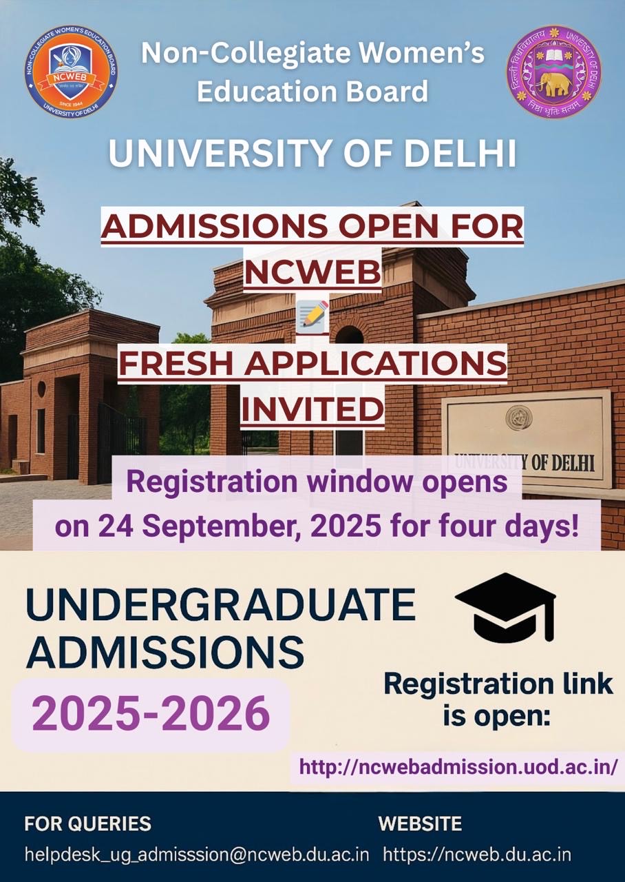 Delhi University was established in 1922 and by an amendment of Delhi University Act in 1943, women students were enabled to take some of the examination of the University with special coaching but without attending regular classes. This gave shape to the Non-Collegiate Women’s Education Board (NCWEB), which is now well established. At present, the enrolment in NCWEB is more than 30,000. Only women students residing in the National capital Territory of Delhi can enroll themselves as students of the Board. NCWEB is a unique system with lectures on weekends leaving students with five working days to follow their dream.