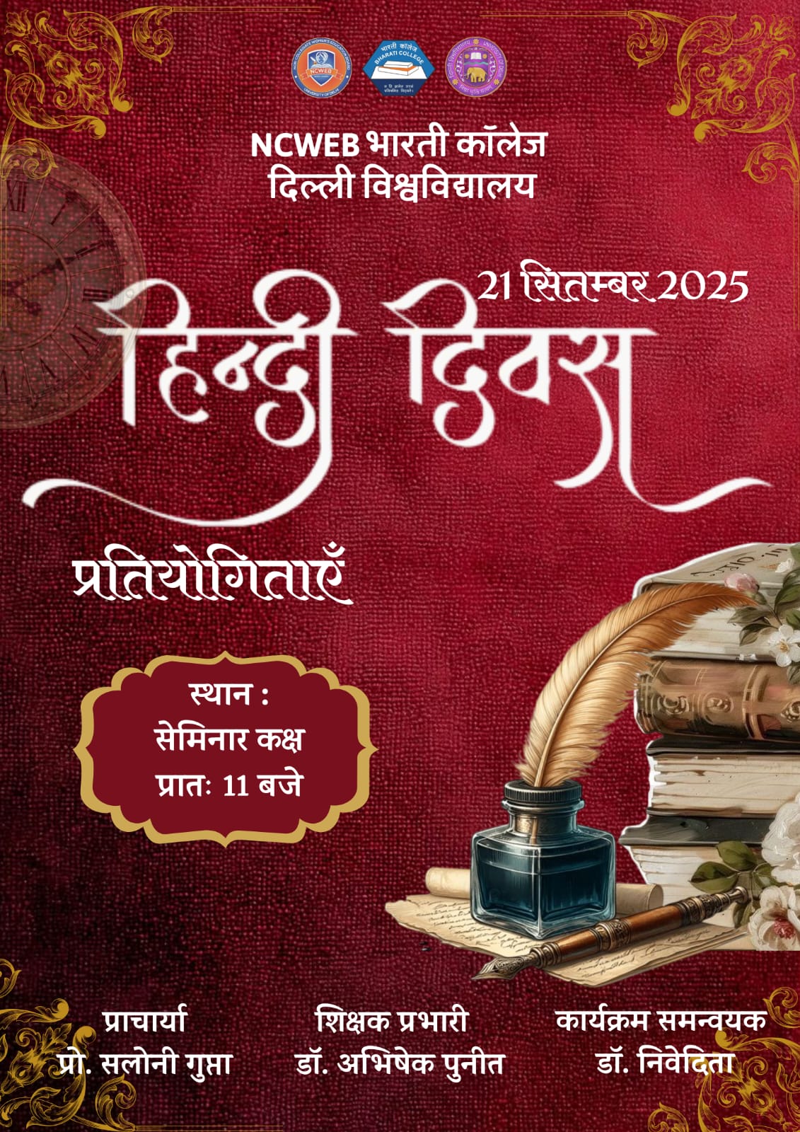 | 27 | NCWEB भारती कॉलेज में हिंदी दिवस प्रतियोगिताओं का आयोजन — 21 सितम्बर 2025, प्रातः 11 बजे, सेमिनार कक | View |