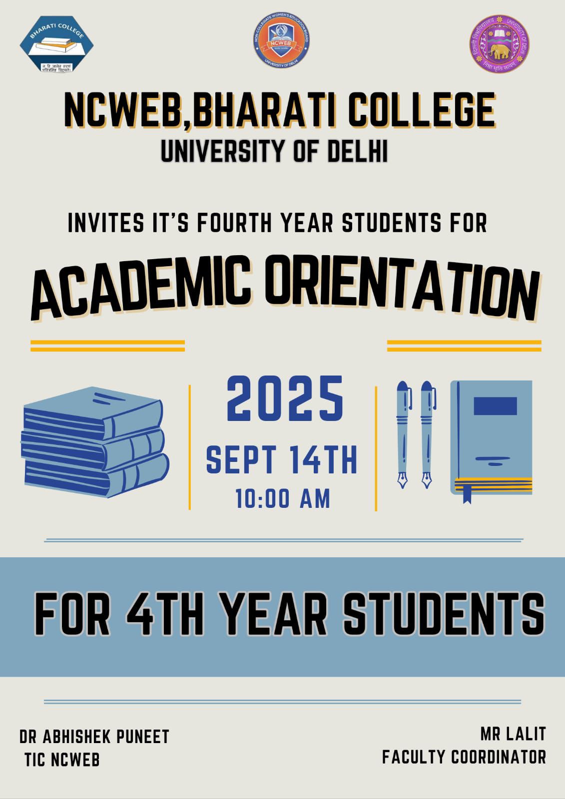 | 28 | NCWEB, Bharati College organises ‘Academic Orientation for 4th Year Students’ on 14th September 2025 | View |