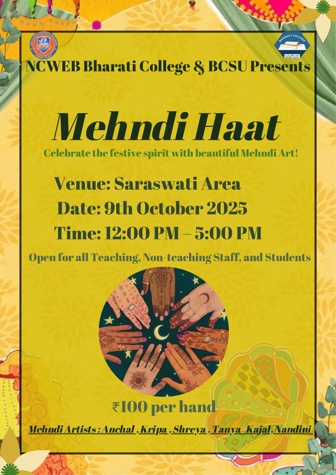 | 23 | NCWEB Bharati College & BCSU Presents: Mehndi Haat at Saraswati Area on 9th October 2025 from 12 | View |