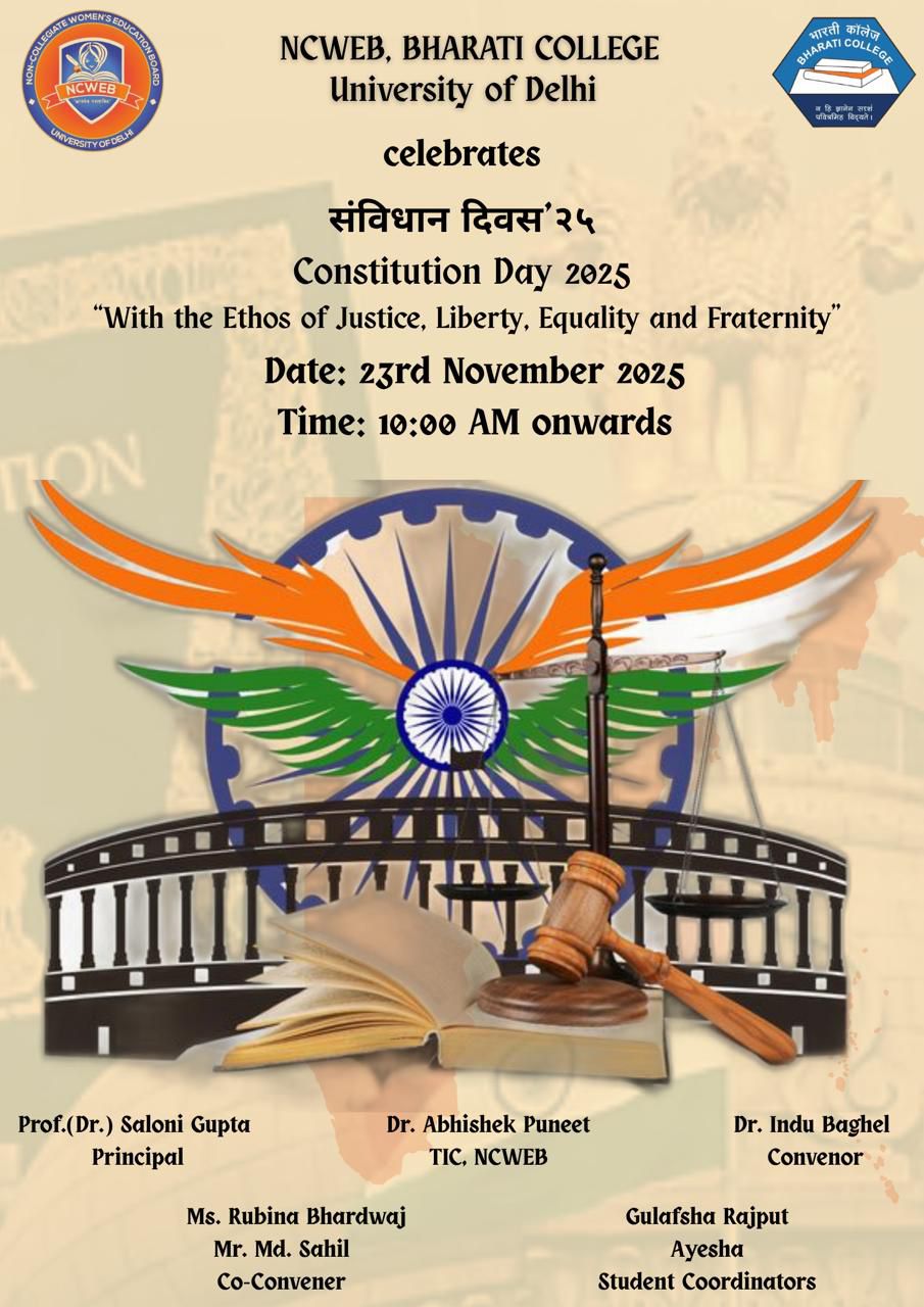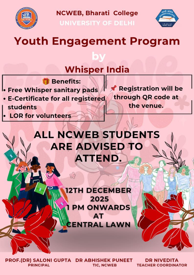 | 24 | NCWEB, Bharati College is organising a Distinguished Inter-Disciplinary Lecture Series I by Prof. Alpana Mishra on 5th October 2025 at 11:30 AM in Seminar Room, Bharati College. | View |